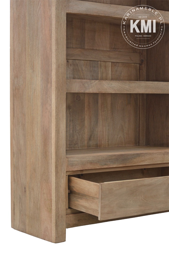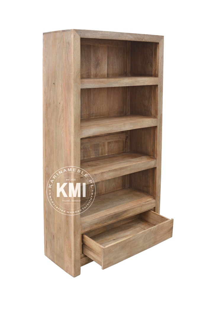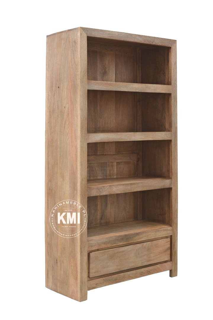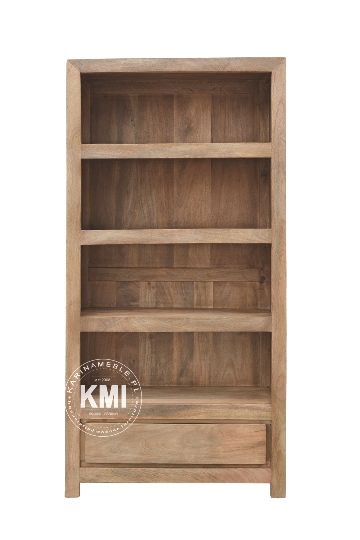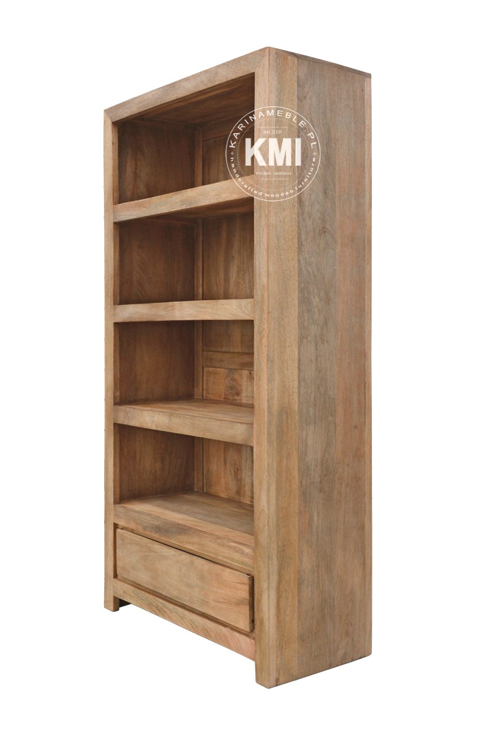 Stwórz wymarzoną przestrzeń na swoją domową kolekcję książek i dekoracji, wybierając solidne i bezkompromisowe meble drewniane. Prosta i minimalistyczna biblioteczka z drewna mango (90x40x180 cm) to kwintesencja najwyższej funkcjonalności. Jej surowa, zgeometryzowana forma idealnie wpisuje się w meble nowoczesne, skandynawskie oraz loftowe. Wyposażona w cztery pojemne, grube półki i bardzo praktyczną szufladę u dołu, stanowi doskonały regał mango do salonu czy domowego gabinetu. Naturalne wykończenie transparentnym woskiem sprawia, że ta biblioteczka drewniana zachwyca ciepłym odcieniem i autentycznym usłojeniem, wprowadzając harmonię do Twojego domu.