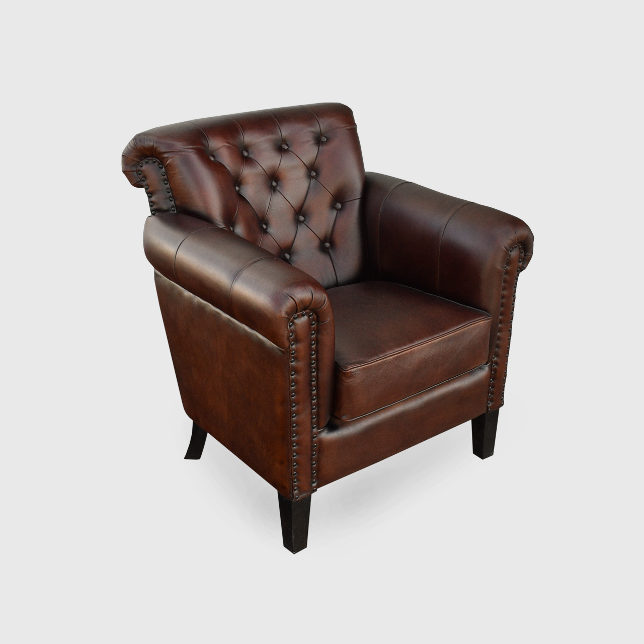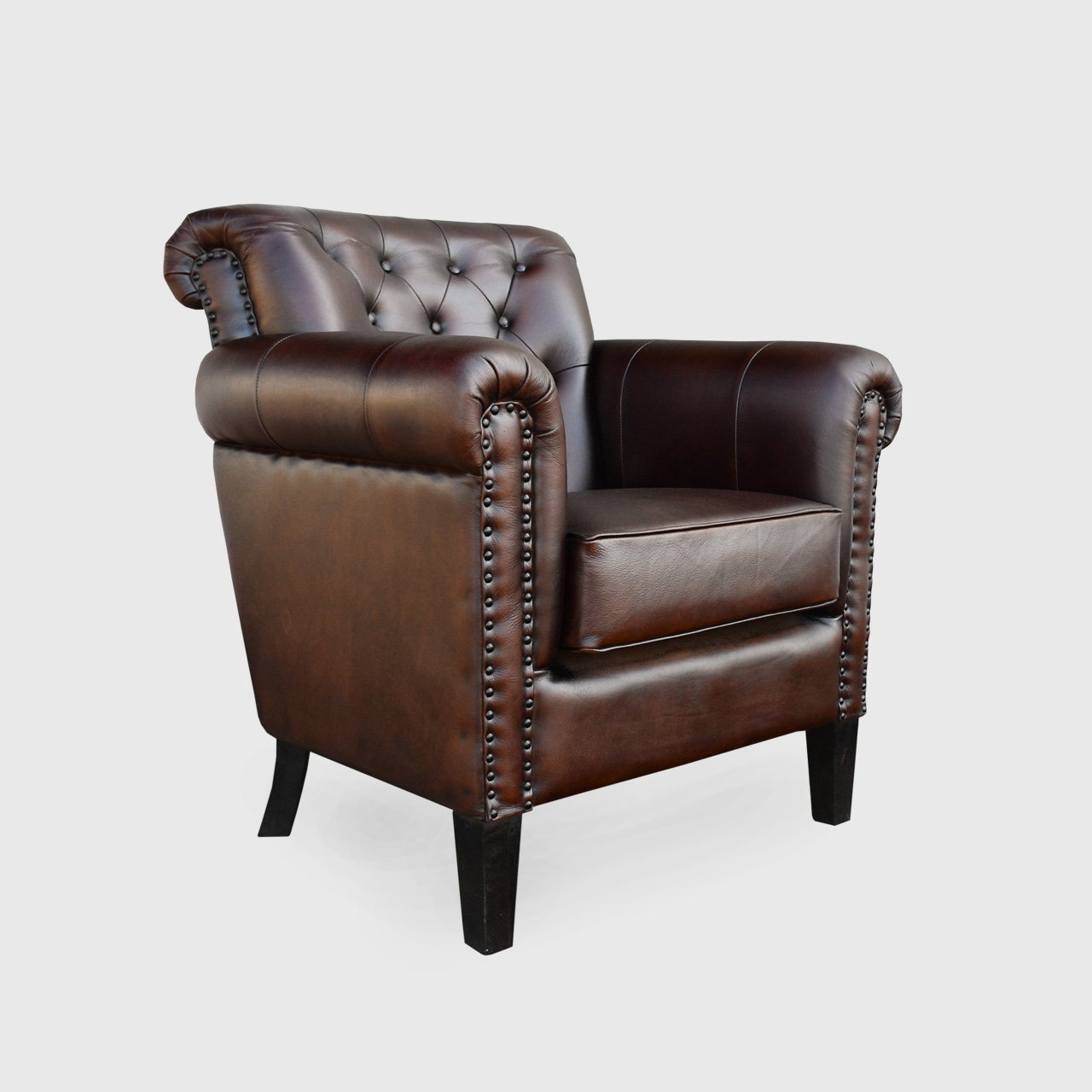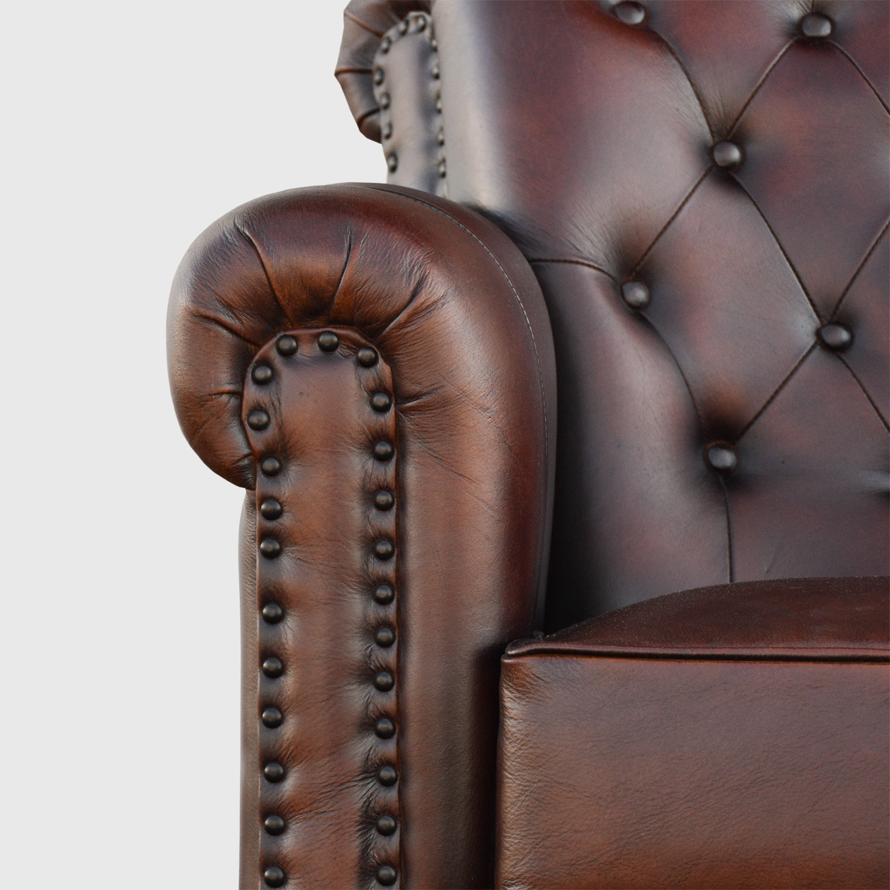 Wprowadź do swojego salonu lub gabinetu wyrafinowany, industrialny klimat, wybierając bezkompromisowe meble loftowe. Ten niezwykle elegancki fotel skórzany (87x84x93 cm) został w całości obity naturalną skórą kozią w głębokim, czekoladowym odcieniu. Klasyczne, głębokie pikowania oparcia, zaokrąglone podłokietniki wykończone metalowymi dżetami i proste, drewniane nóżki nadają mu luksusowy, a zarazem surowy charakter. To wymarzony, wygodny fotel loftowy, który stanie się ulubionym miejscem Twojego relaksu.