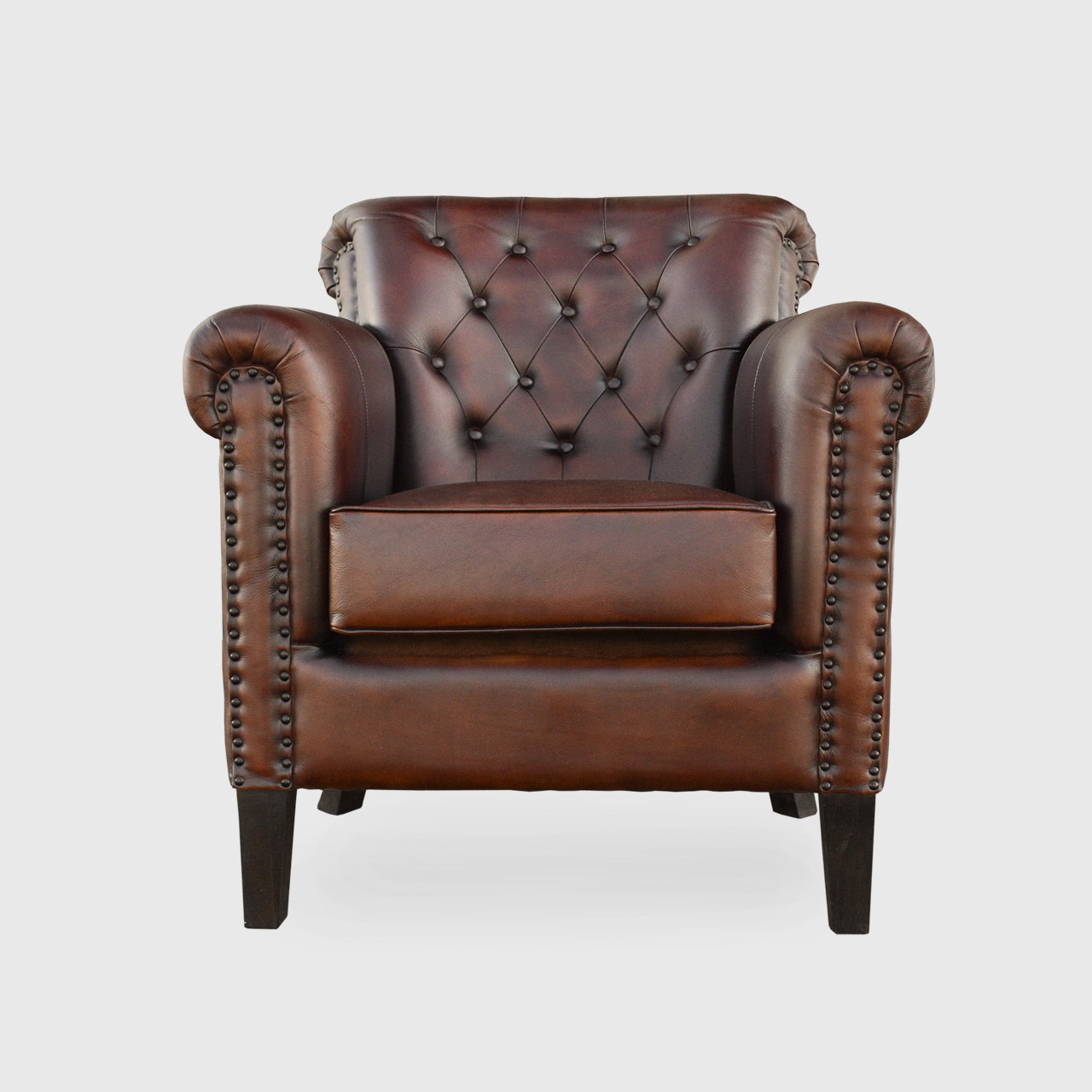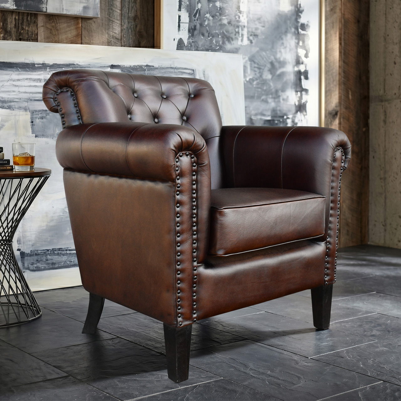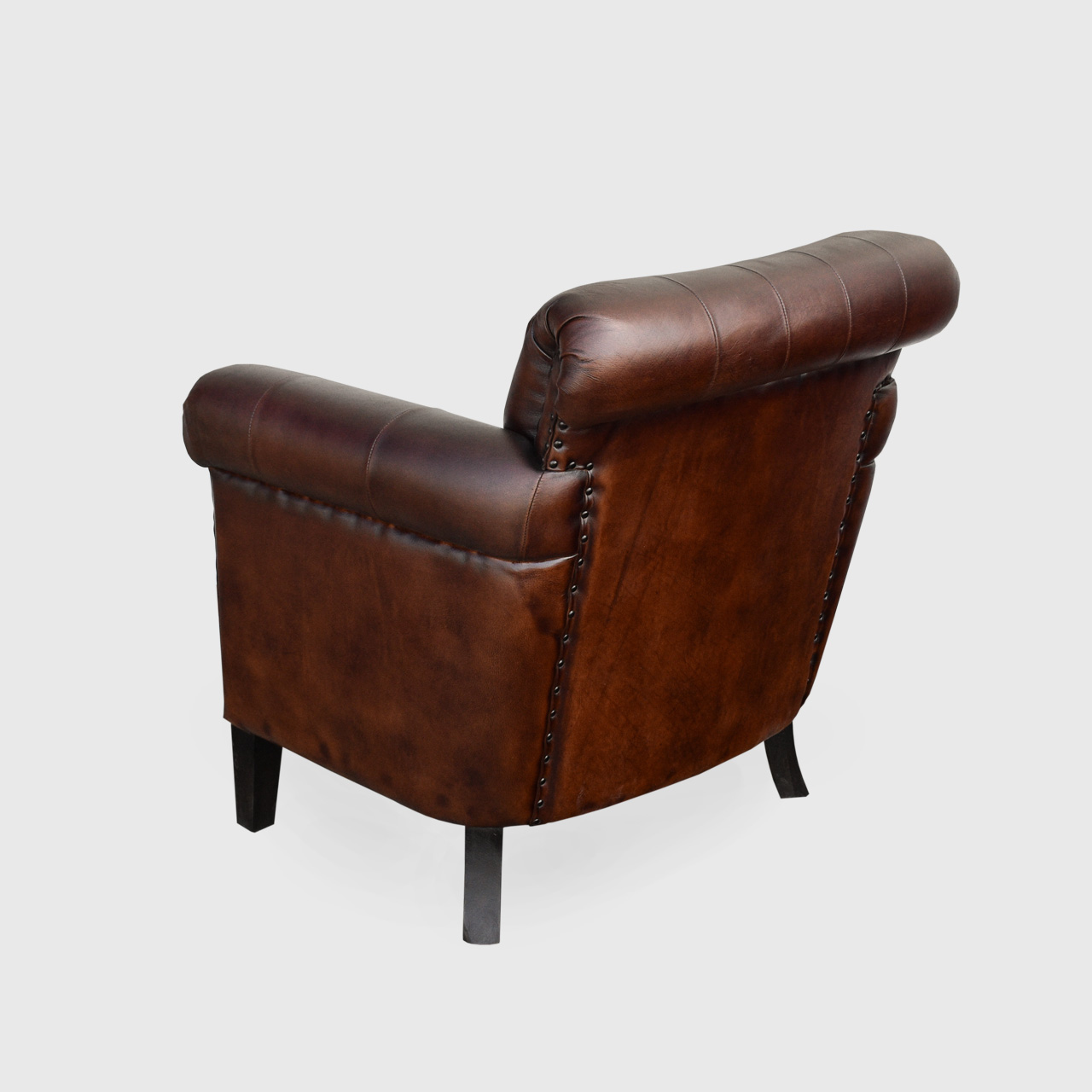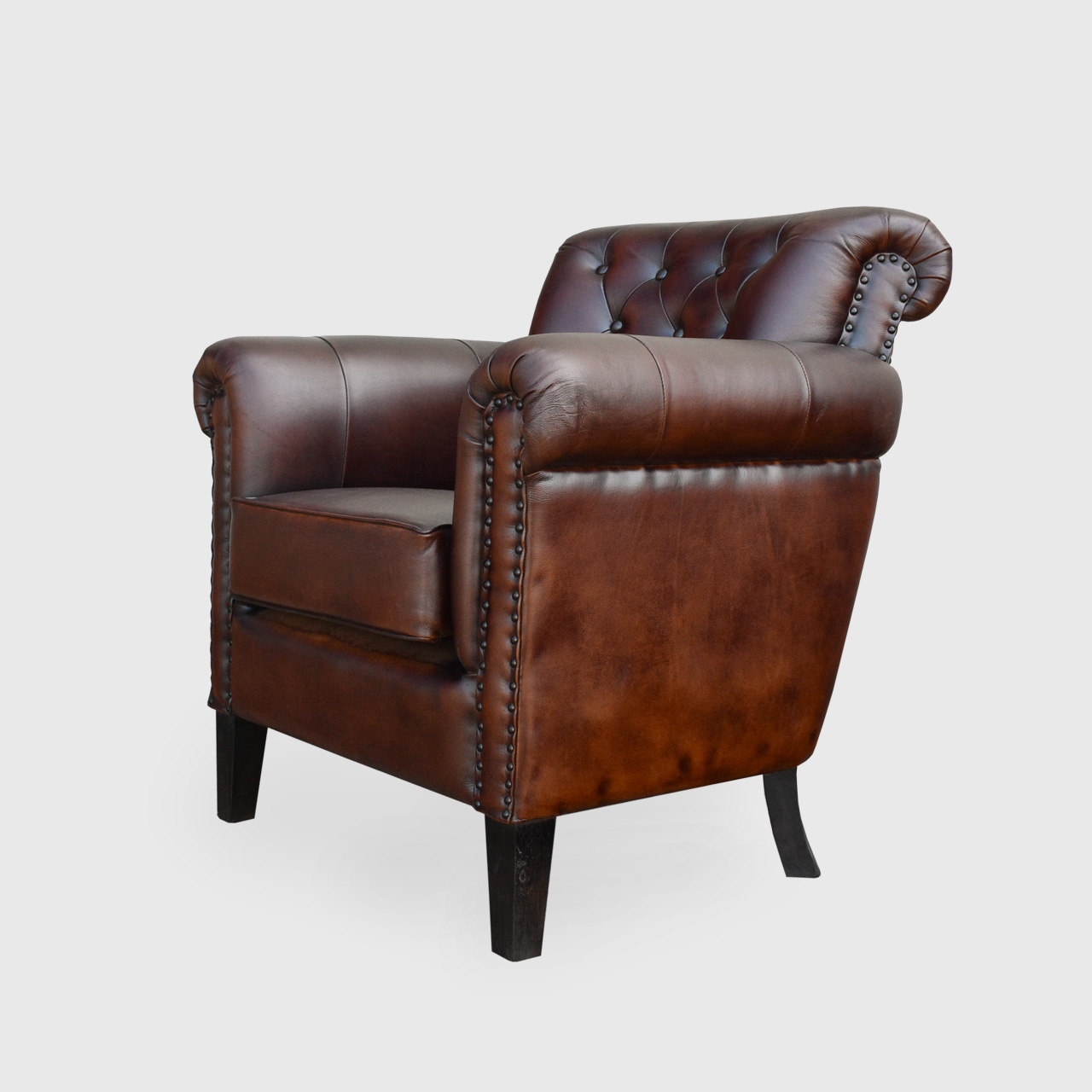 Wprowadź do swojego salonu lub gabinetu wyrafinowany, industrialny klimat, wybierając bezkompromisowe meble loftowe. Ten niezwykle elegancki fotel skórzany (87x84x93 cm) został w całości obity naturalną skórą kozią w głębokim, czekoladowym odcieniu. Klasyczne, głębokie pikowania oparcia, zaokrąglone podłokietniki wykończone metalowymi dżetami i proste, drewniane nóżki nadają mu luksusowy, a zarazem surowy charakter. To wymarzony, wygodny fotel loftowy, który stanie się ulubionym miejscem Twojego relaksu.