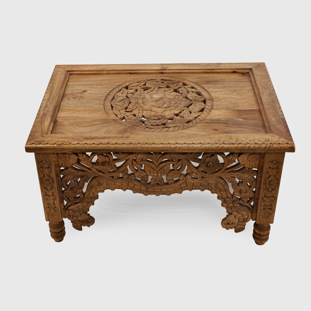 stolik drewniany rzeźbiony blat z centralną florystyczną rozetą lite drewno mango meble indyjskie z góry