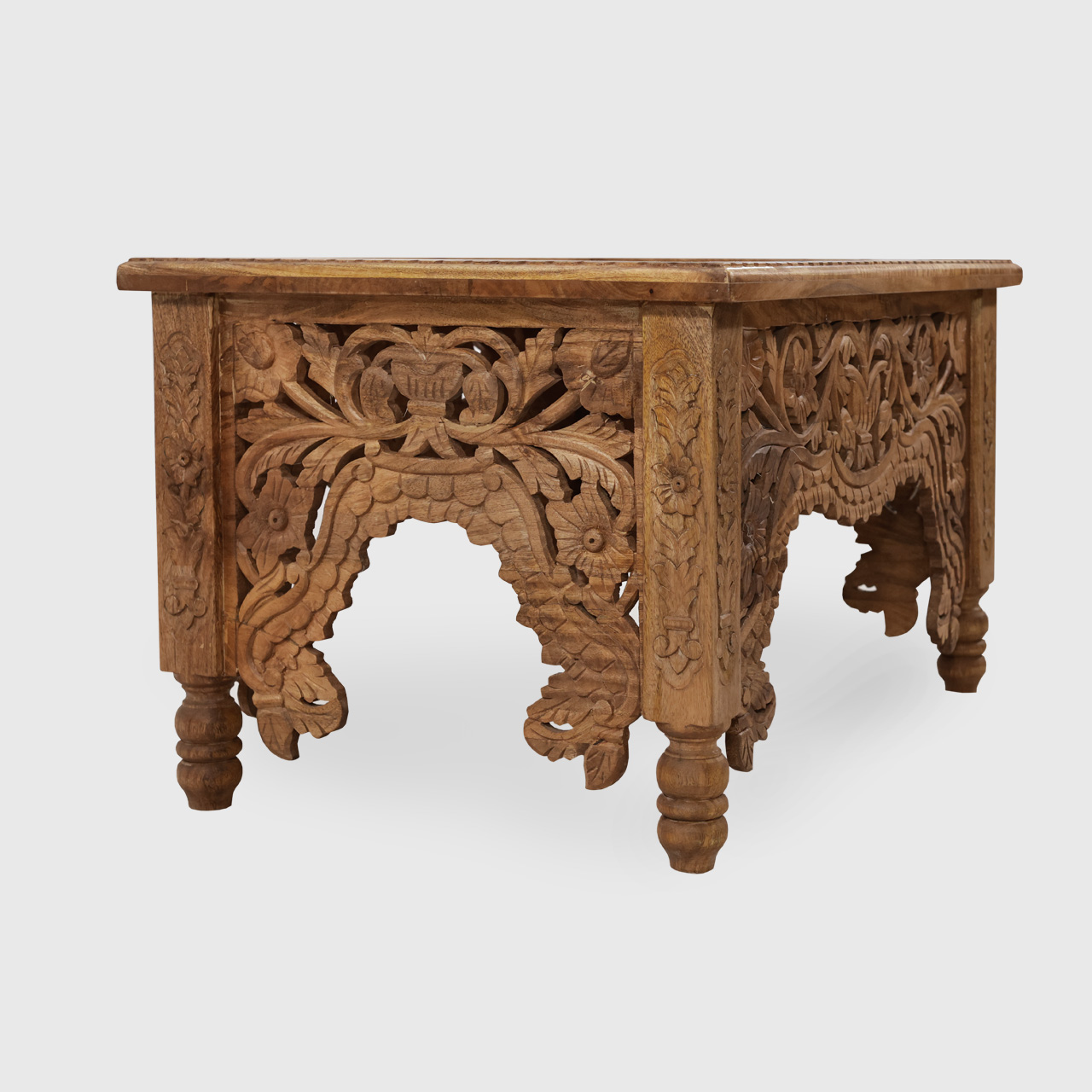 Przenieś się w świat baśniowego rzemiosła i luksusu, wybierając autentyczne meble orientalne. Ten zjawiskowy, bogato zdobiony stolik orientalny (90x60x50 cm) to arcydzieło ręcznej pracy, wykonane w całości z litego drewna mango. Jego korpus zachwyca głębokimi, dłutowanymi motywami florystycznymi, a środek blatu zdobi przepiękna, wyrzeźbiona rozeta. Całość wykończono w ciepłym, eleganckim odcieniu jasnego orzecha i zabezpieczono lakierem. To niezwykle efektowny i stabilny stolik indyjski, który stanie się centralnym punktem Twojego salonu. Odkryj, jak niezwykłe potrafią być klasyczne meble indyjskie i solidne meble drewniane tworzone z pasją.