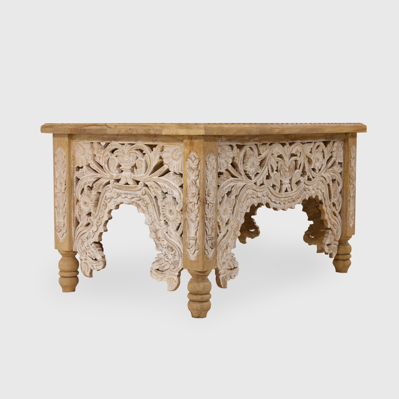 • Florystyczny Relief 3D z Bieleniem: Boki stolika (oskrzynia) to prawdziwy popis wschodniego rzemiosła. Zostały one głęboko wydłutowane w powtarzalne motywy wijących się pnączy i kwiatów. To, co wyróżnia ten model, to ręczne bielenie rzeźbień, które fenomenalnie kontrastuje z naturalnym tłem, nadając bryle trójwymiarowości i lekkości.