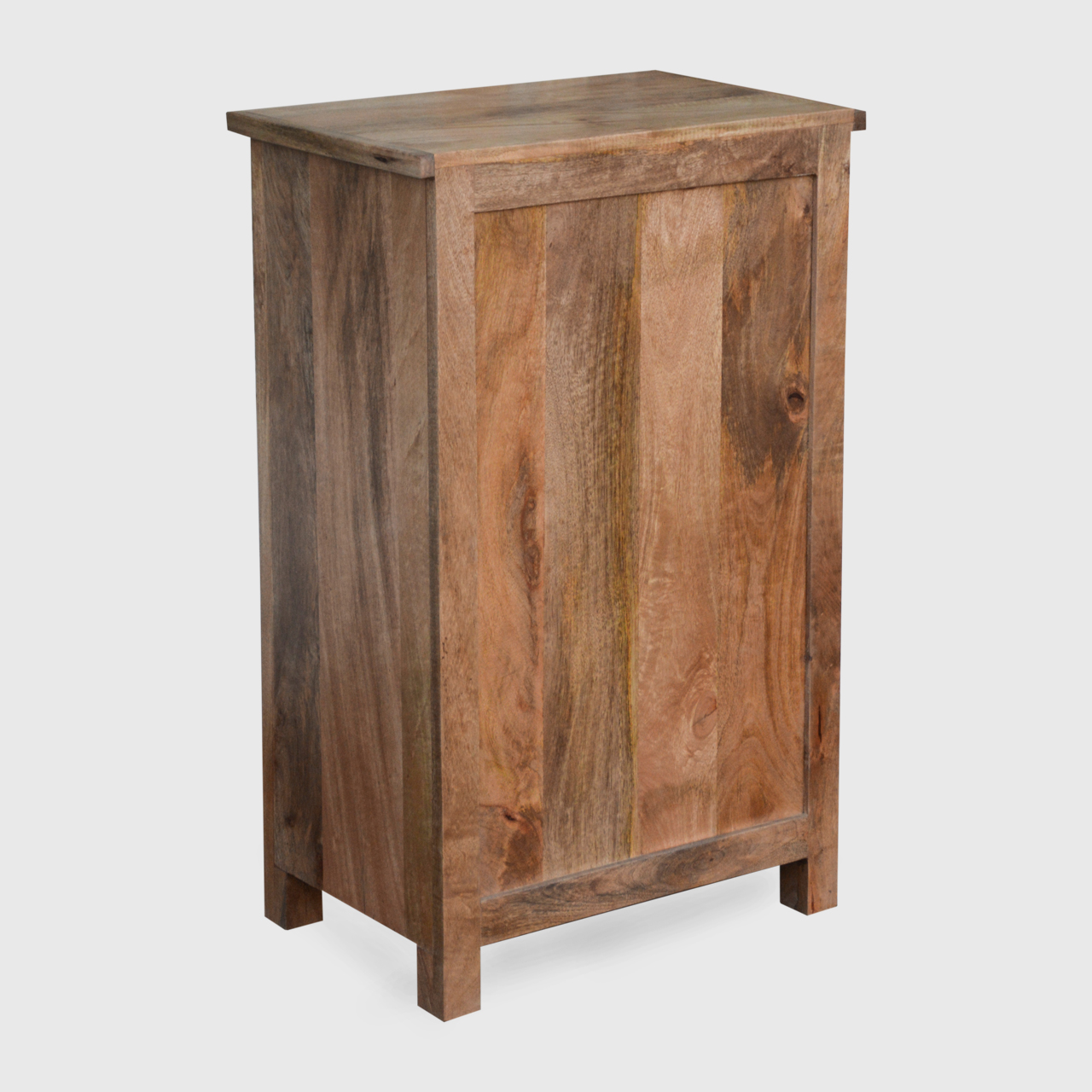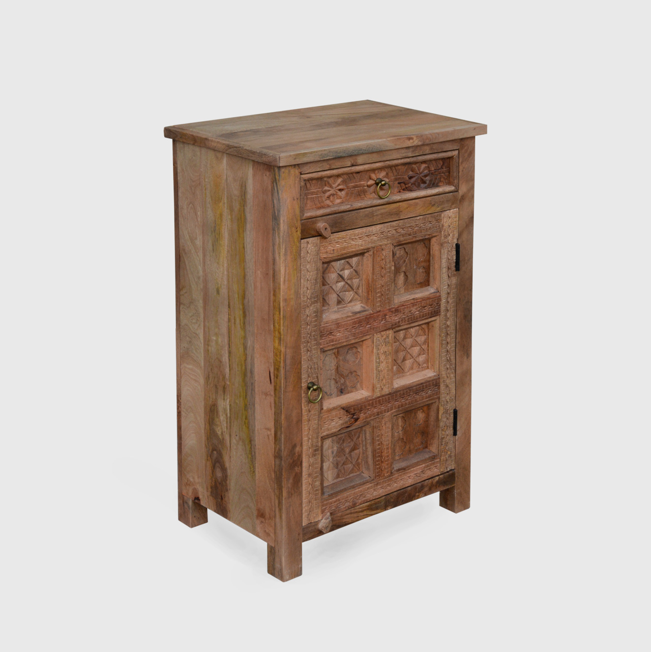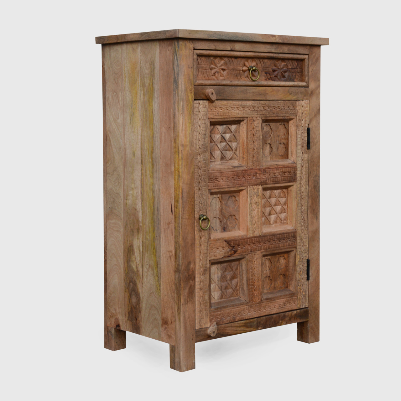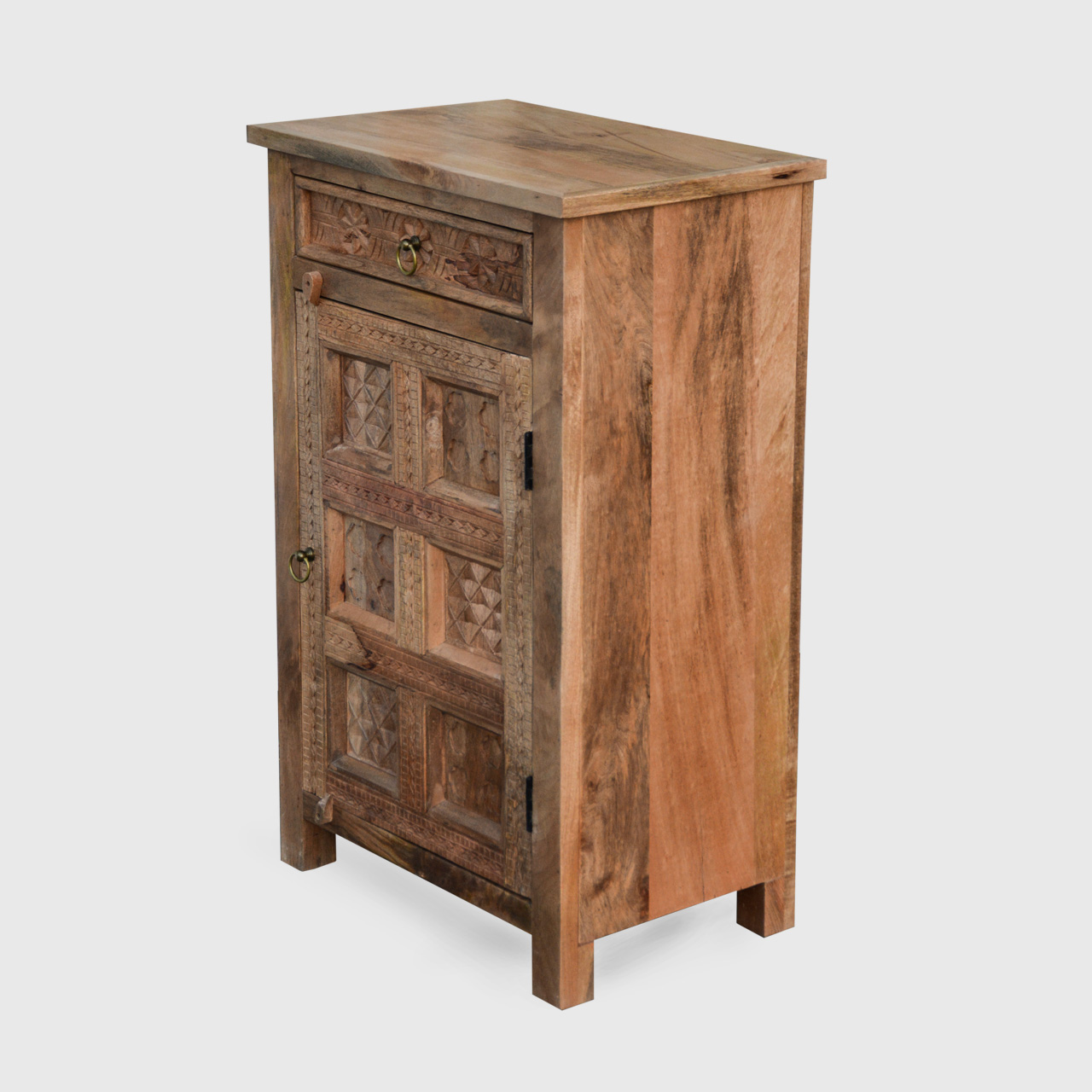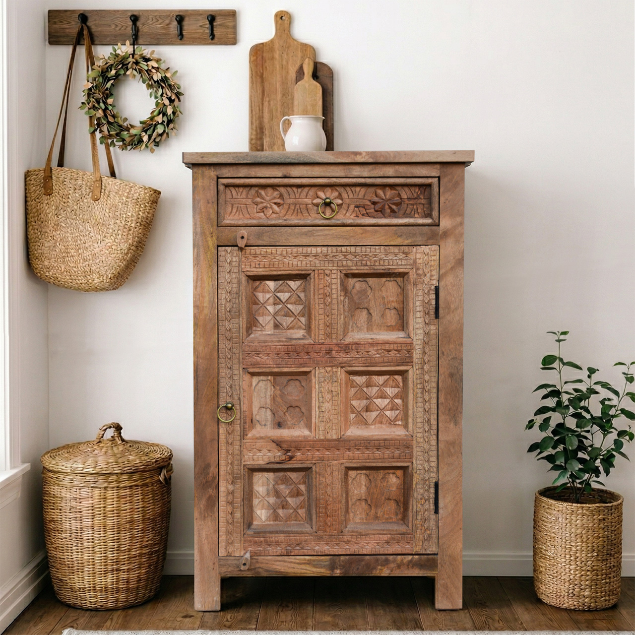 Poczuj naturalny klimat we wnętrzu dzięki rzeźbionej szafce indyjskiej (60x45x90 cm). Wykonana z litego drewna mango w ciepłym odcieniu jasnego orzecha, wyróżnia się unikalnymi, geometryczno-kwiatowymi wzorami. Posiada szufladę i szafkę z półką. To idealna, wąska komoda do przedpokoju lub sypialni w stylu boho.